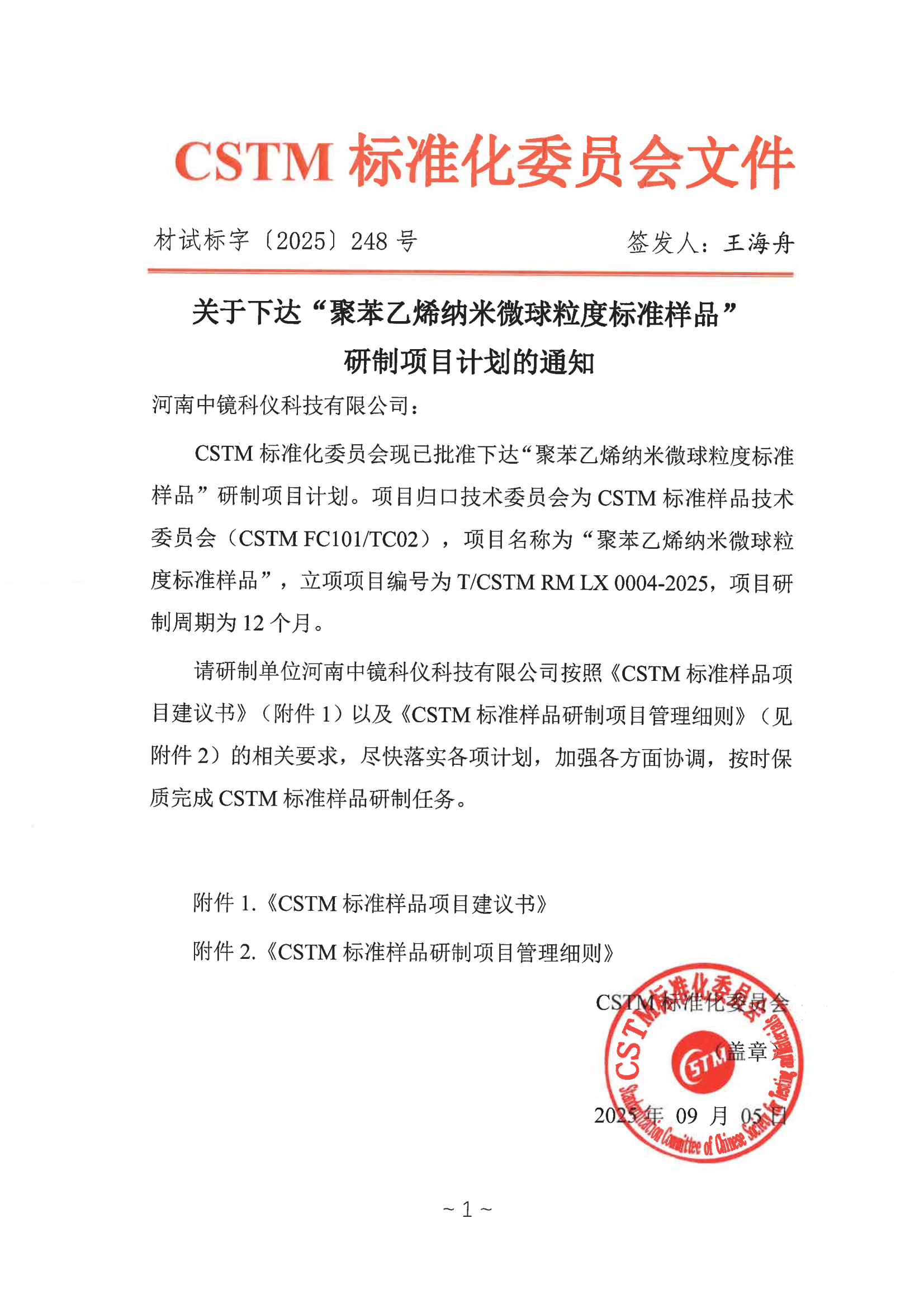 祝贺中镜科仪 在CSTM首批标准样品研制项目 立项论证会中成功立项! 近日,CSTM标准化委员会传来消息,在首批标准样品研制项目立项论证会上,河南中镜科仪科技有限公司申报的“聚苯乙烯纳米微球粒度标准样品”项目,经过评审,成功获得立项(项目编号:T/CSTM RM LX 0004-2025)。 该项目隶属于CSTM标准样品技术委员会(CSTM FC101/TC02),其立项既是对中镜科仪在纳米材料标准化领域研究实力的权威认可,也是对公司长期以来致力于标准化工作的肯定。项目计划周期为12个月,研制期间将严格遵循《CSTM标准样品项目建议书》及《CSTM标准样品研制项目管理细则》的要求,确保各项研制工作科学、规范、高效推进。 此次“聚苯乙烯纳米微球粒度标准样品”的研制,将为纳米材料的粒度分析提供准确、可靠的参照标准,有助于提升我国纳米材料产业的整体质量水平,促进相关产业的发展。 未来,中镜科仪将持续提升技术实力与市场竞争力,为我国标准化事业发展贡献更多力量,有望在标准化领域实现更多创新与突破。