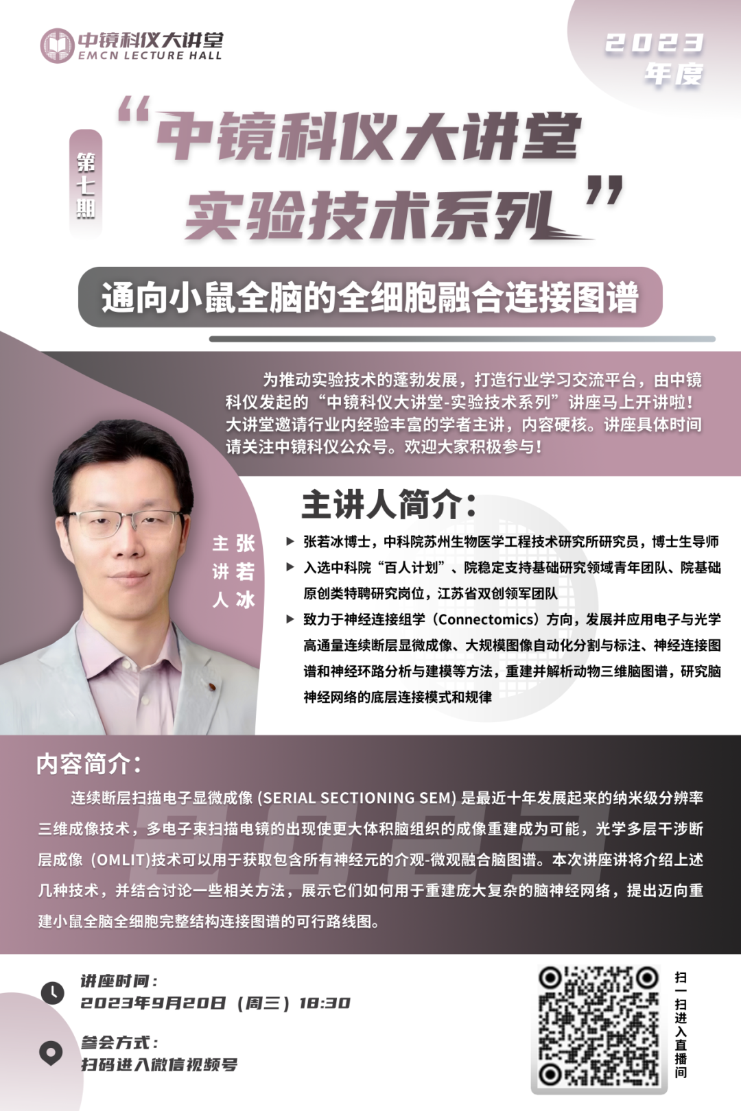 中镜科仪发起的2023年“中镜科仪大讲堂”第七期-“实验技术系列”讲座将于2023年9月20日18:30开讲。本期由张若冰博士带来的《通向小鼠全脑的全细胞融合连接图谱》专题讲座将向大家详细讲解了如何应用电子与光学高通量连续断层显微成像、大规模图像自动化分割与标注、神经连接图谱等方法重建并解析动物三维脑图谱。欢迎大家积极参与,共同推动实验技术的发展!
